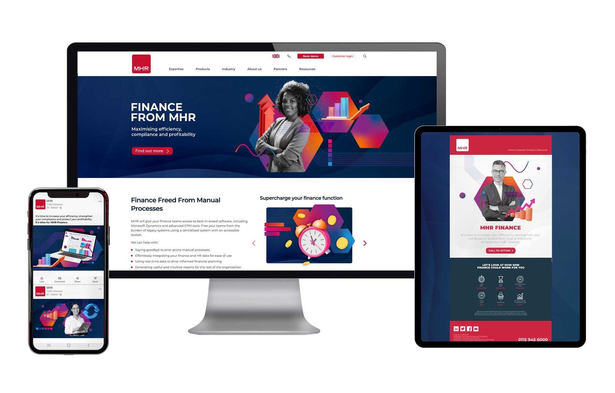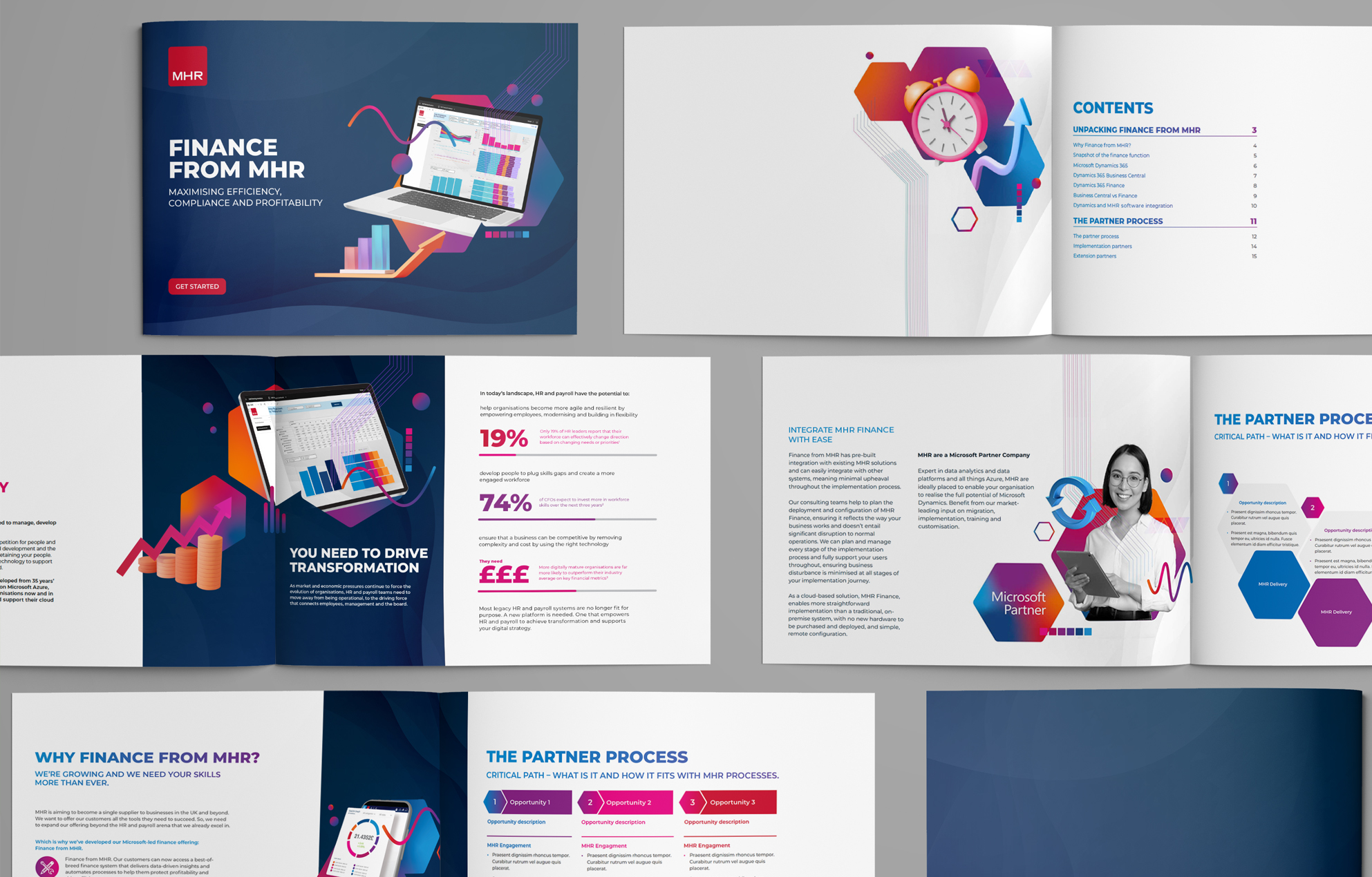 For this project, I led the visual direction for the launch of Finance by MHR, a new service targeting C-suite finance leaders. To appeal to this audience, I developed a clean, corporate visual style and created a set of bespoke graphical illustrations. I also designed a new campaign guide and supporting assets, helping position the product as both professional and innovative.