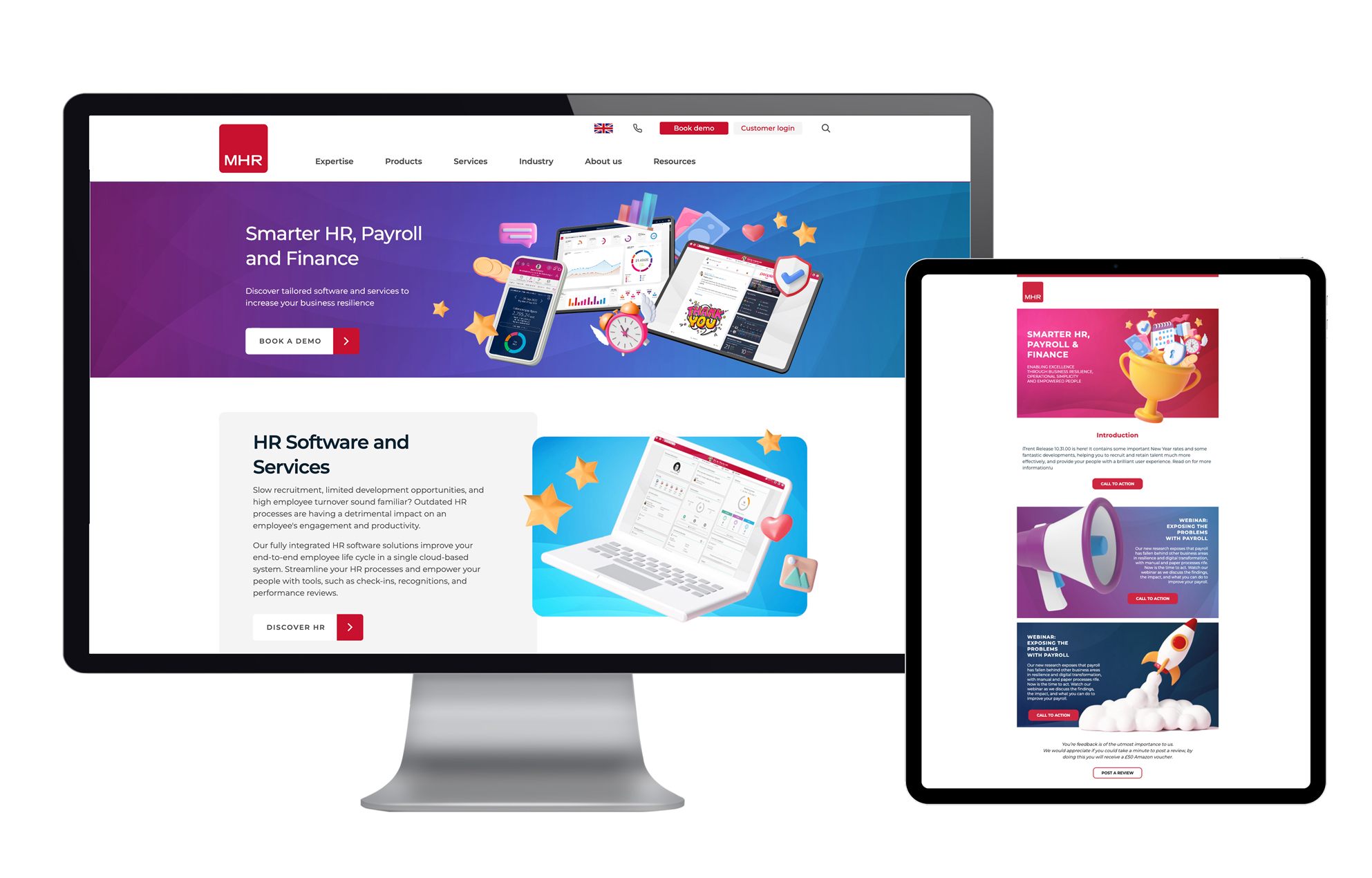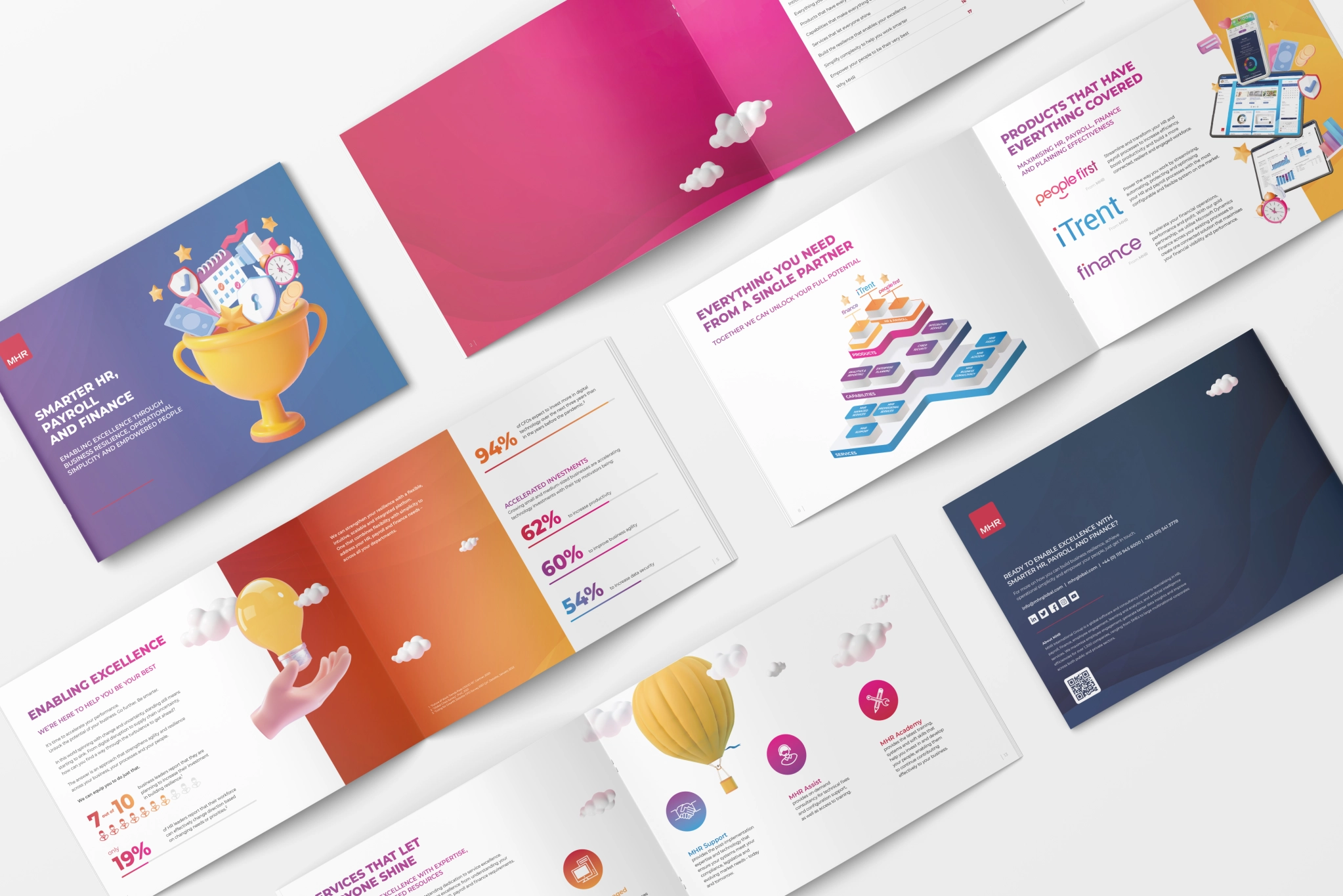 For this project, I led the creative direction for a brand unification and refresh of MHR, bringing together sub-brands such as MHR Analytics, iTrent, and People First under a cohesive visual identity.